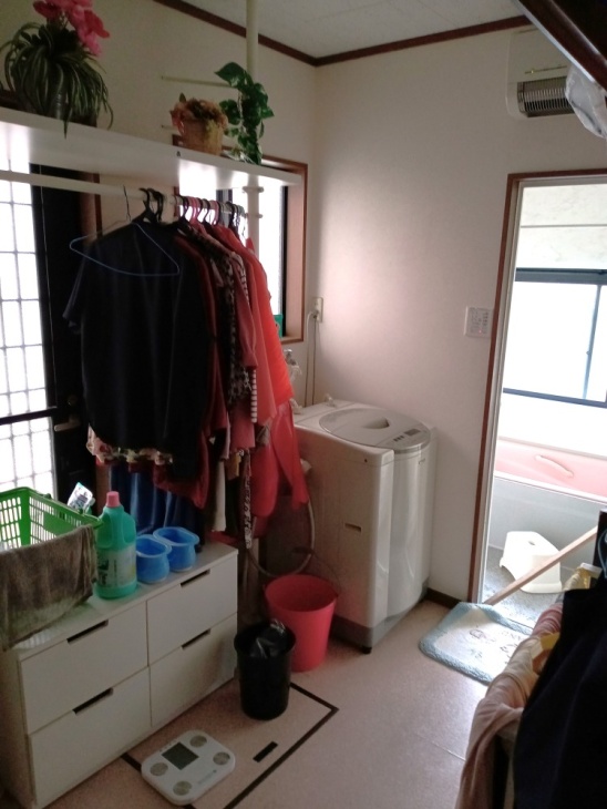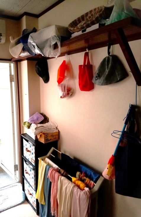 勝手口を塞ぐように置いてあるラックや収納ケース。