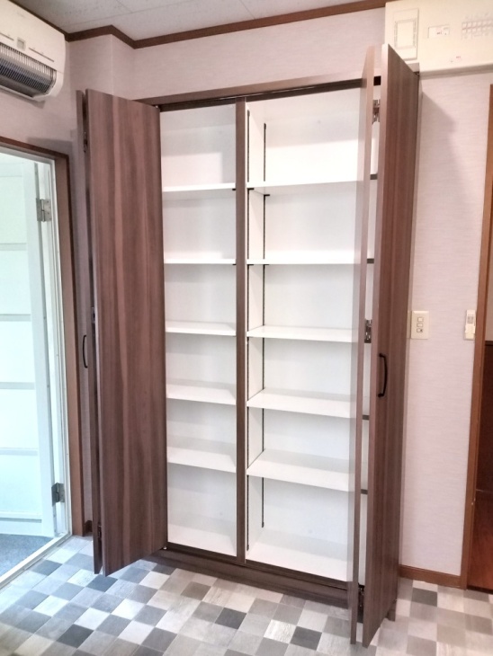 施主様のご希望で高さは200㎝、間口も131㎝とかなり大きめであるうえ可動棚で高さ調節も可能です。
