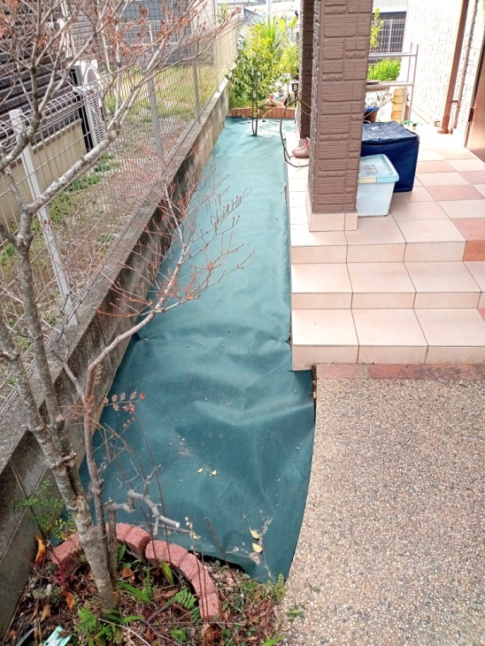 玄関ポーチの周囲だけでなく、お庭にも防草シートを利用し工事を進めていきます。