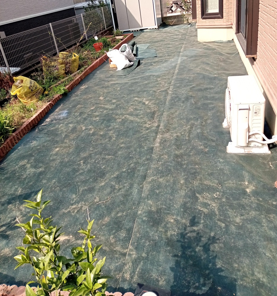玄関ポーチの周囲だけでなく、お庭にも防草シートを利用し工事を進めていきます。