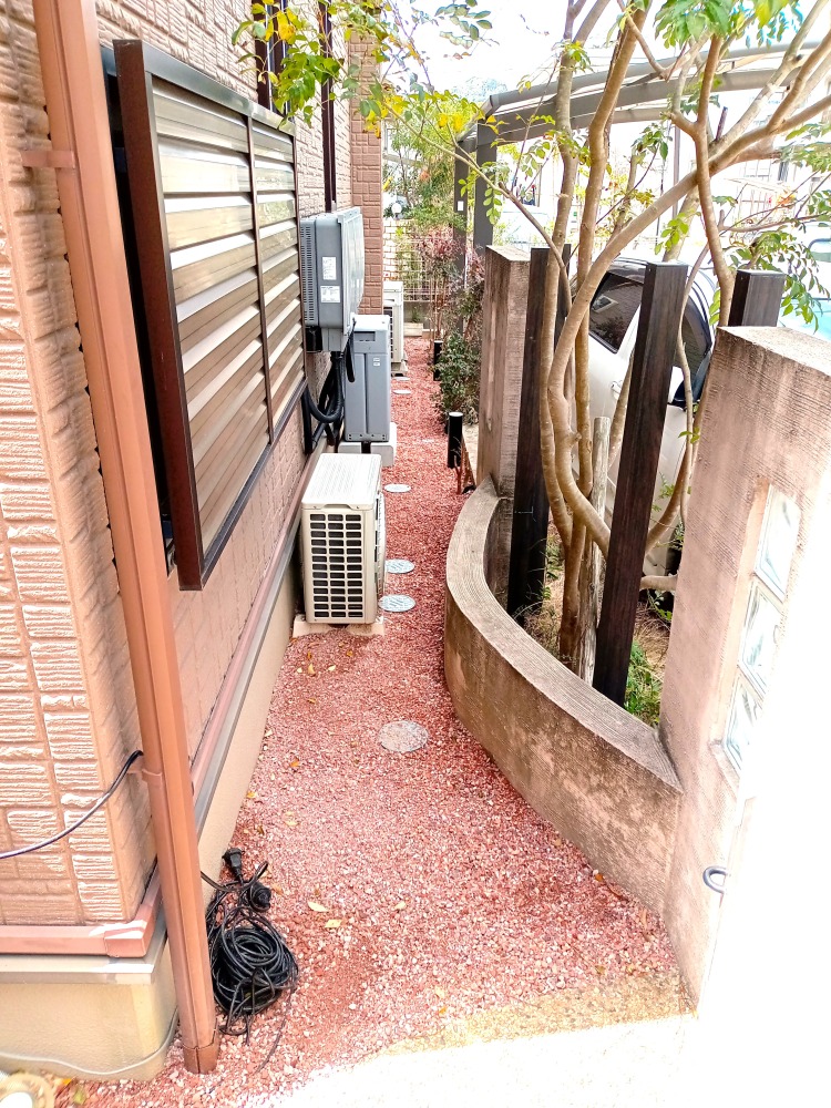 室外機や汚水桝などの周りにも丁寧にレンガチップを敷いて、雑草対策完ぺきです。
