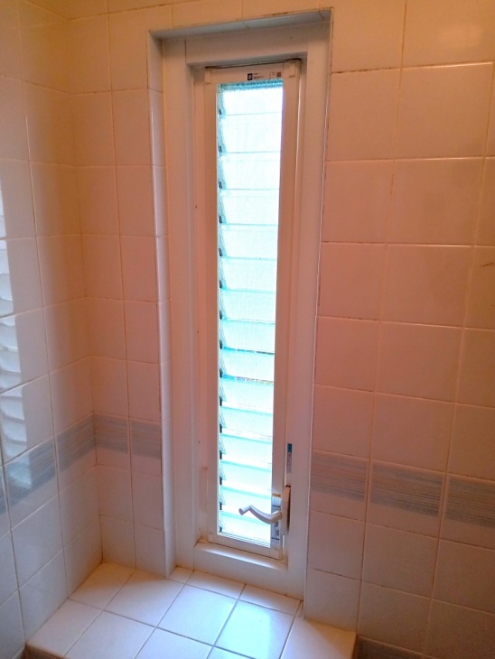 在来工法の浴室で窓はハンドルで開けるタイプのルーバー窓。